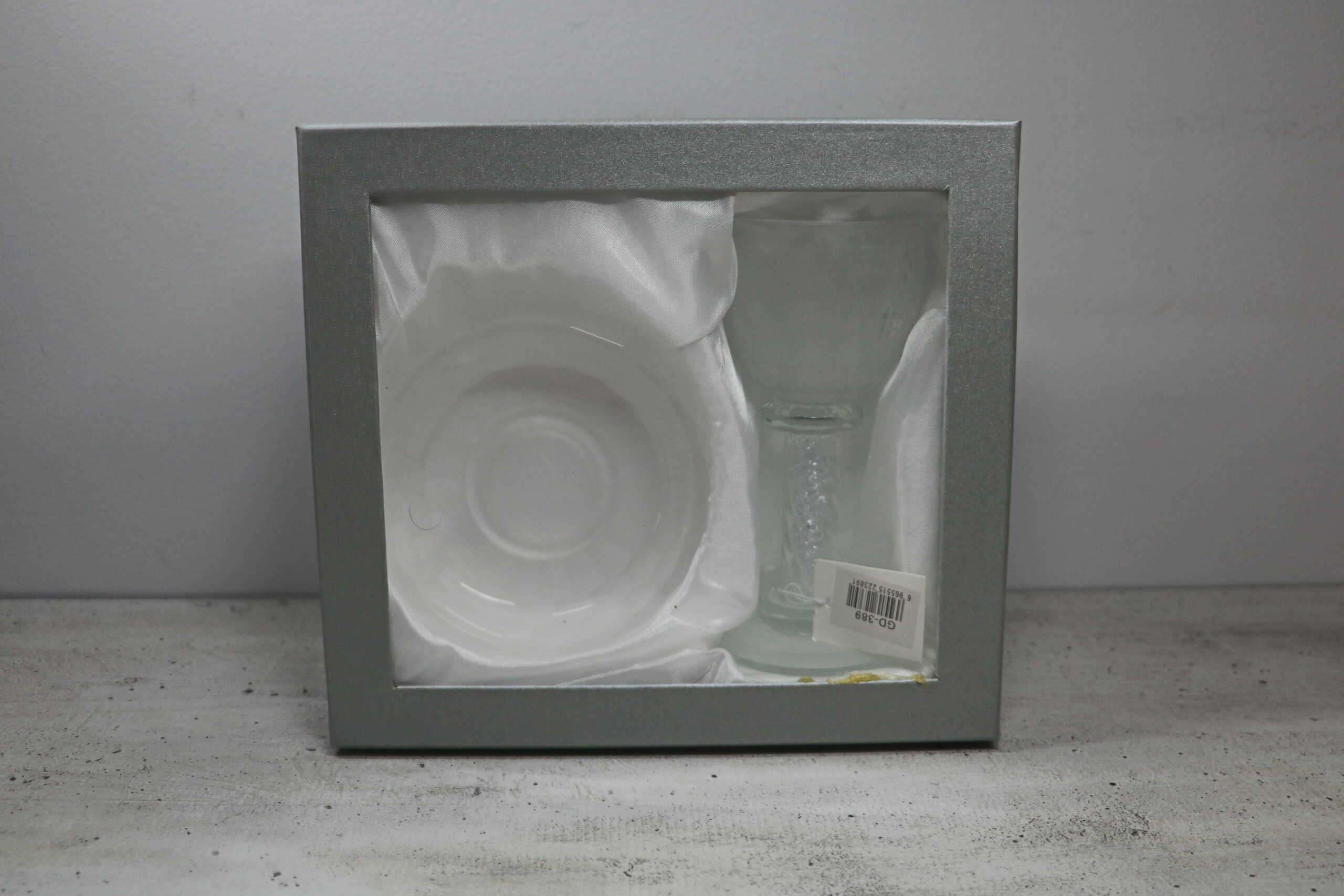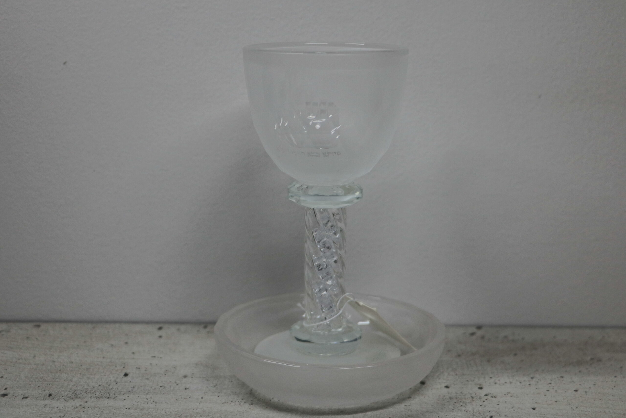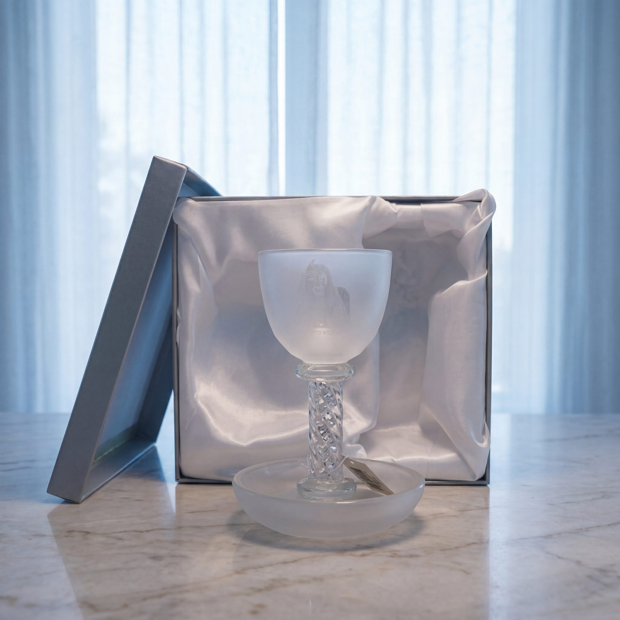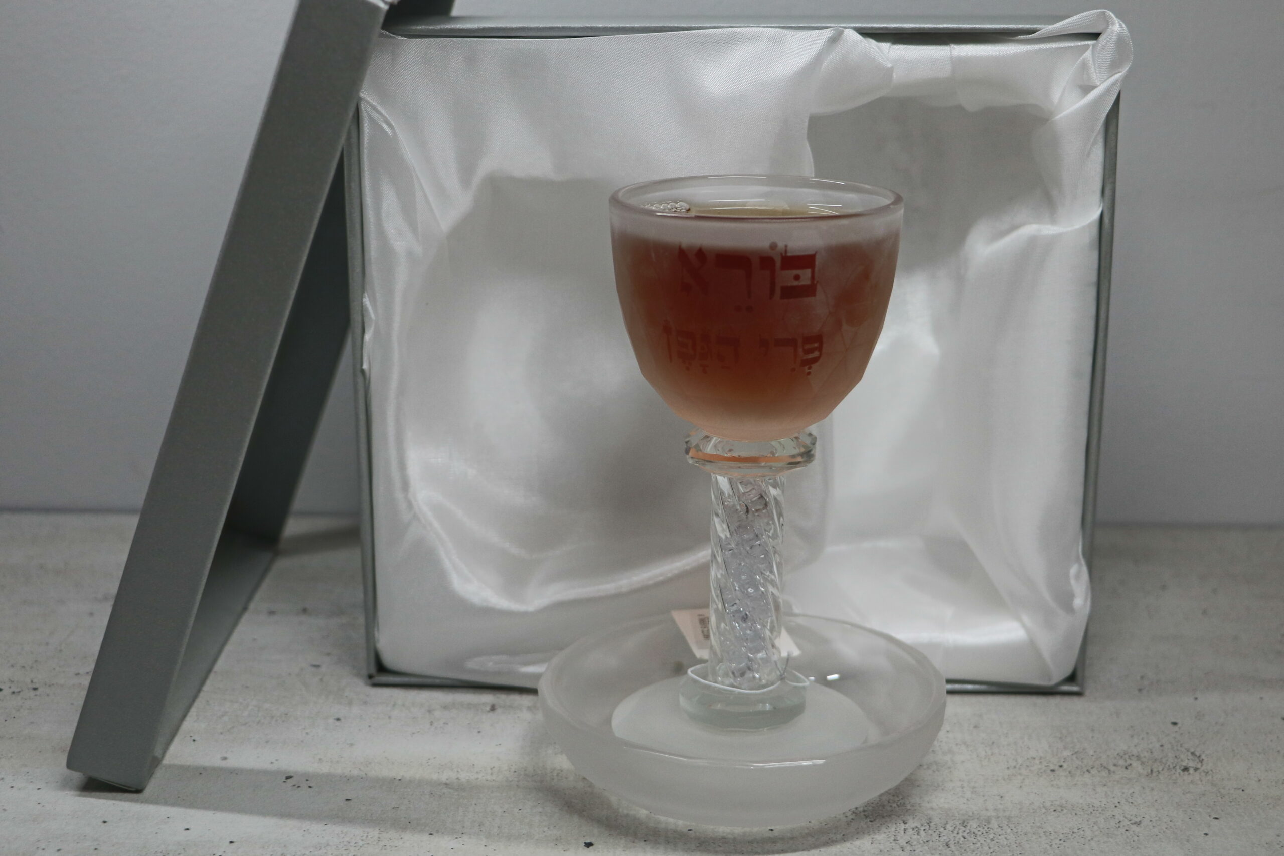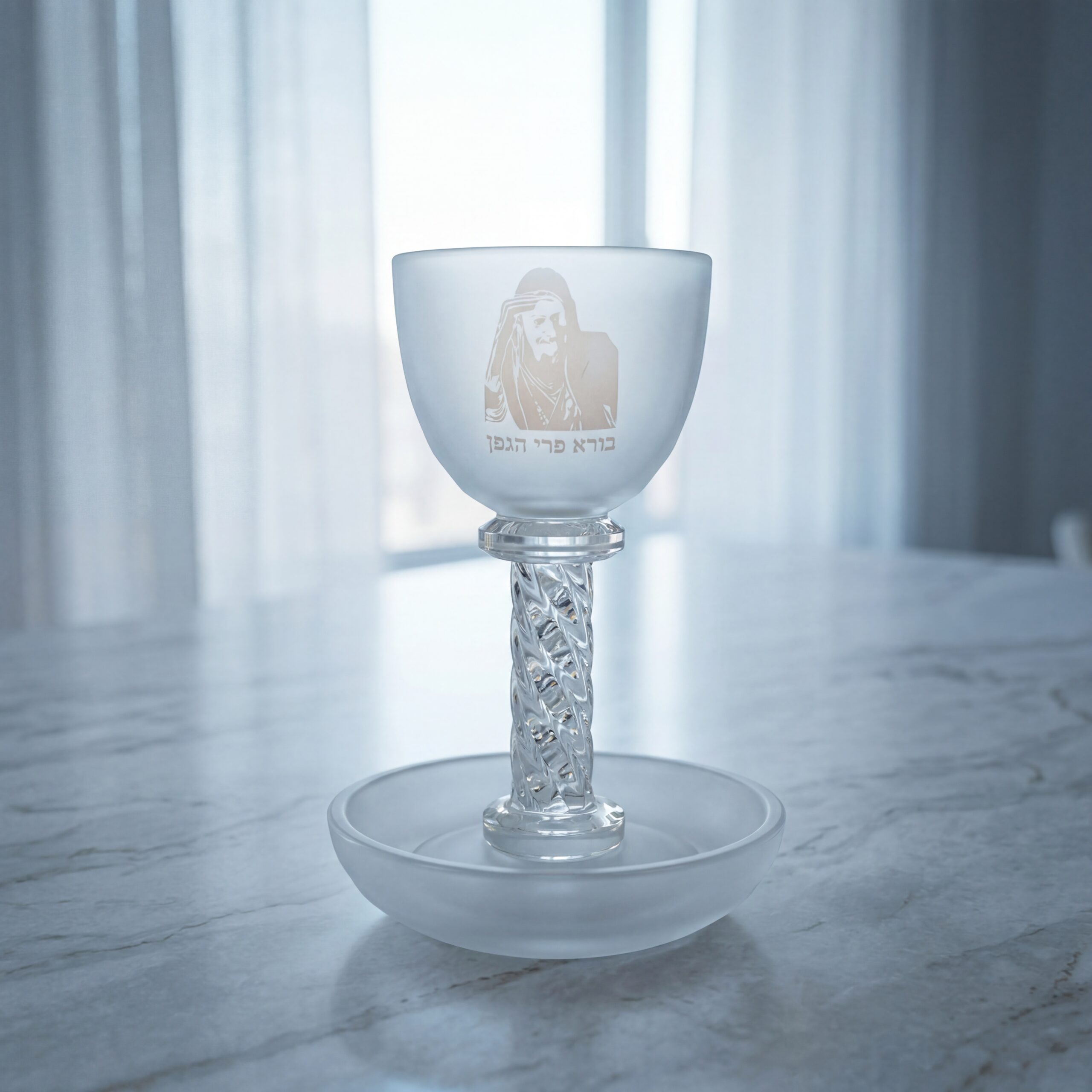 כוס קידוש גבוהה בעיצוב מסורתי עם כיתוב "בורא פרי הגפן" וציור/תבליט של באבא סאלי. בעת מילוי הכוס ביין, הכיתוב והעיצוב בולטים יותר ומקבלים מראה ברור ומכובד במיוחד.