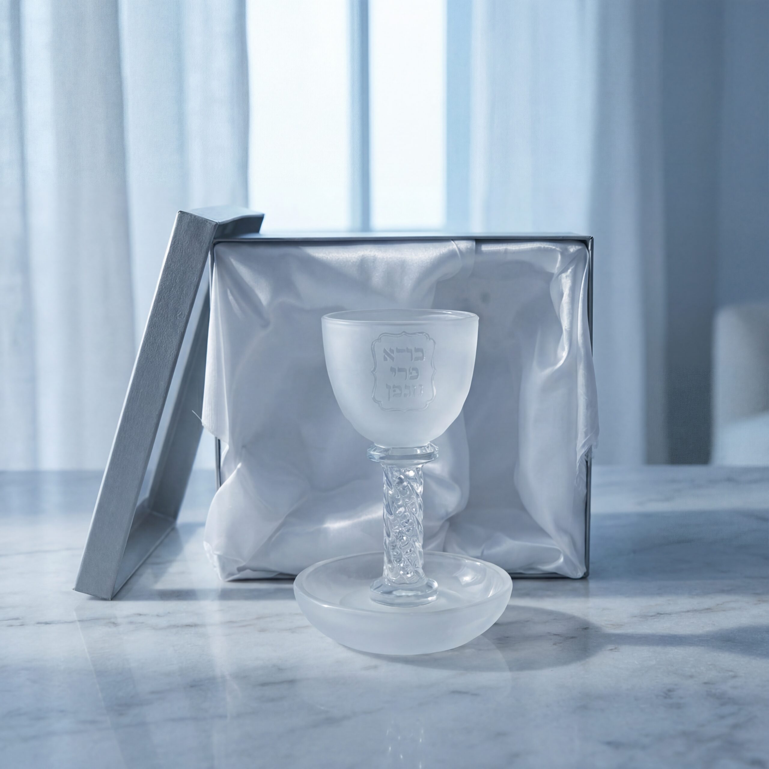 כוס קידוש גבוהה בעיצוב נקי עם כיתוב "בורא פרי הגפן". בעת מילוי הכוס ביין, הכיתוב בולט ונראה בצורה ברורה יותר, מה שמוסיף יופי ונוכחות לשולחן שבת ולחגים.