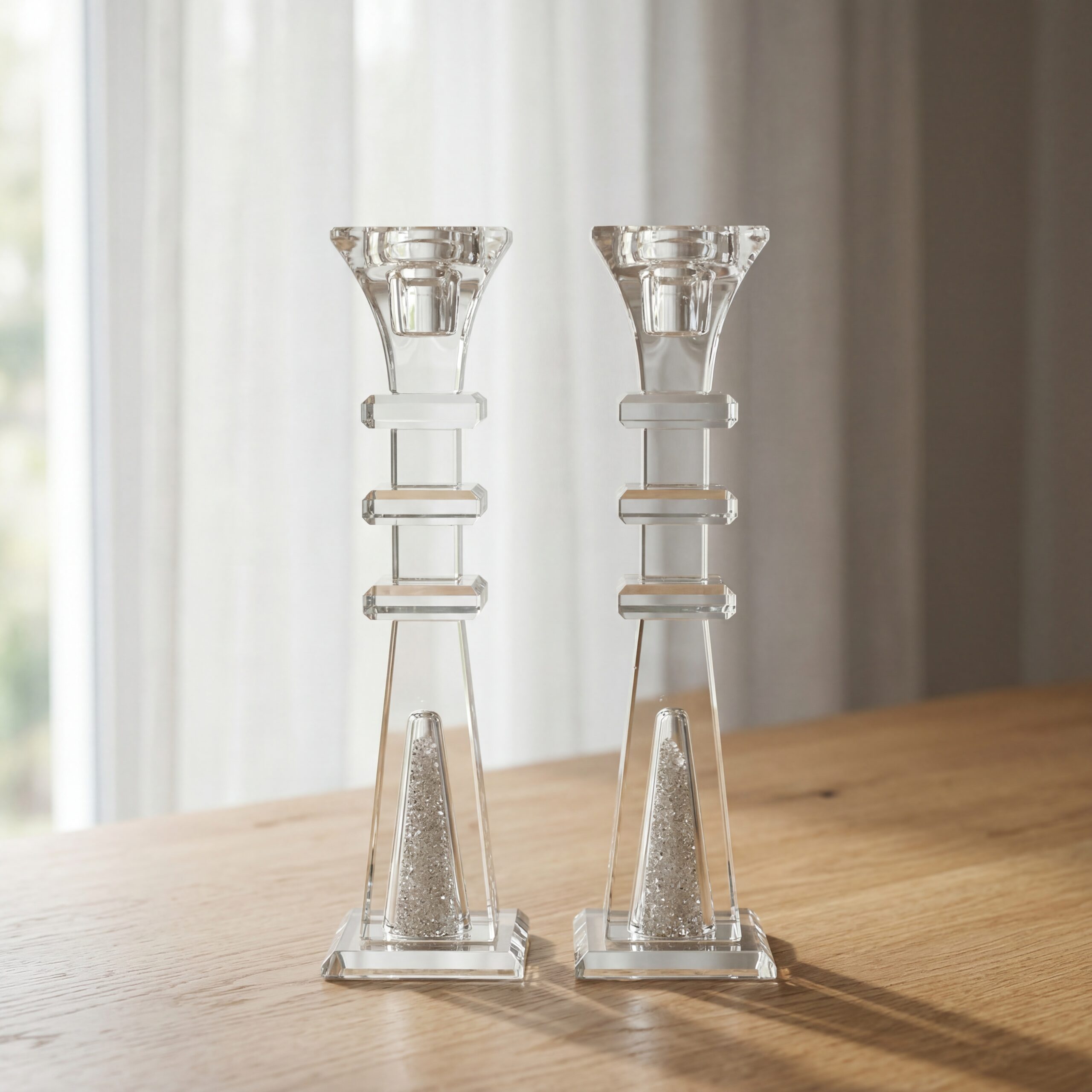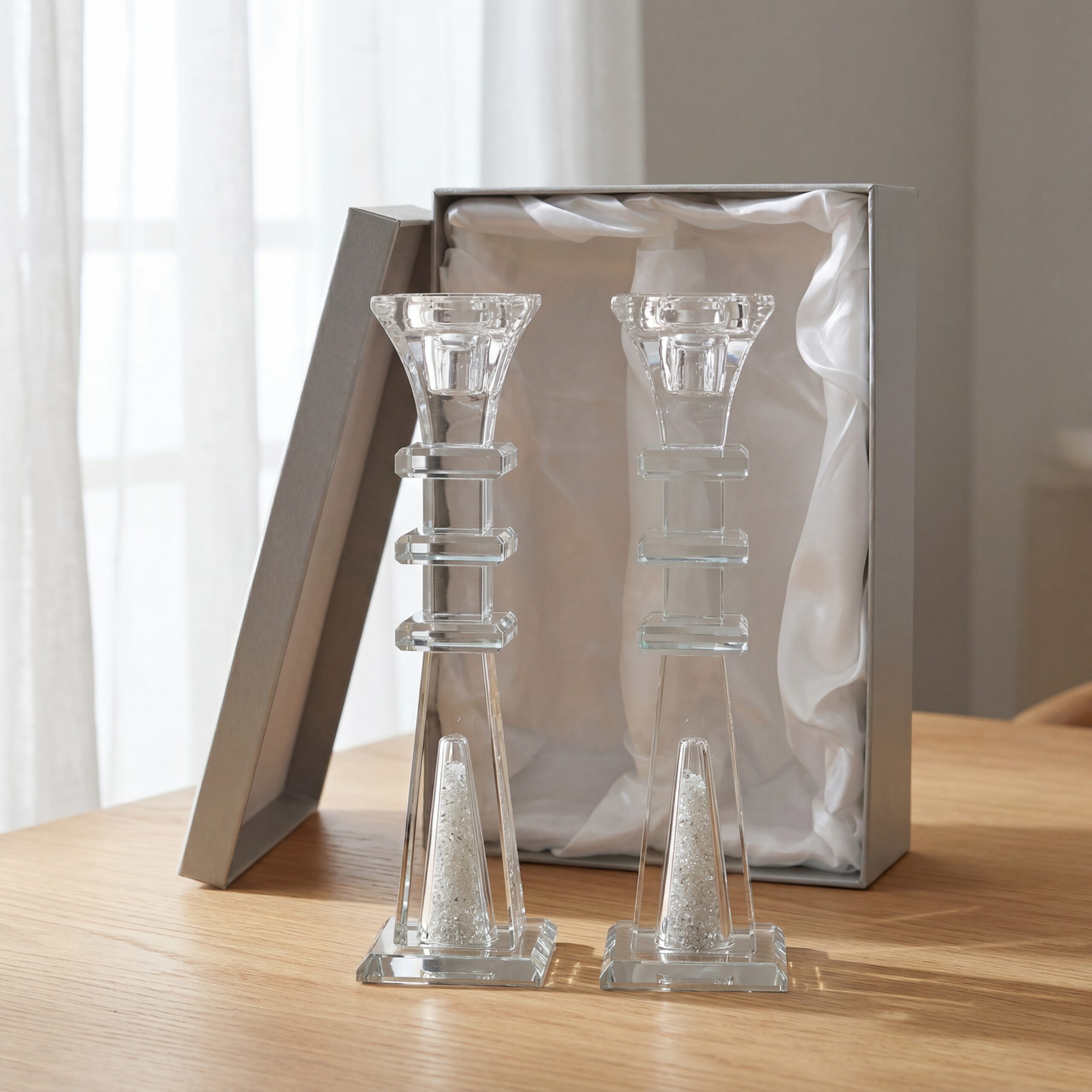 פמוט קריסטל בעיצוב מגדל אייפל, בעל מראה נקי ואלגנטי שמתאים לשולחן שבת, חגים ועיצוב ביתי.