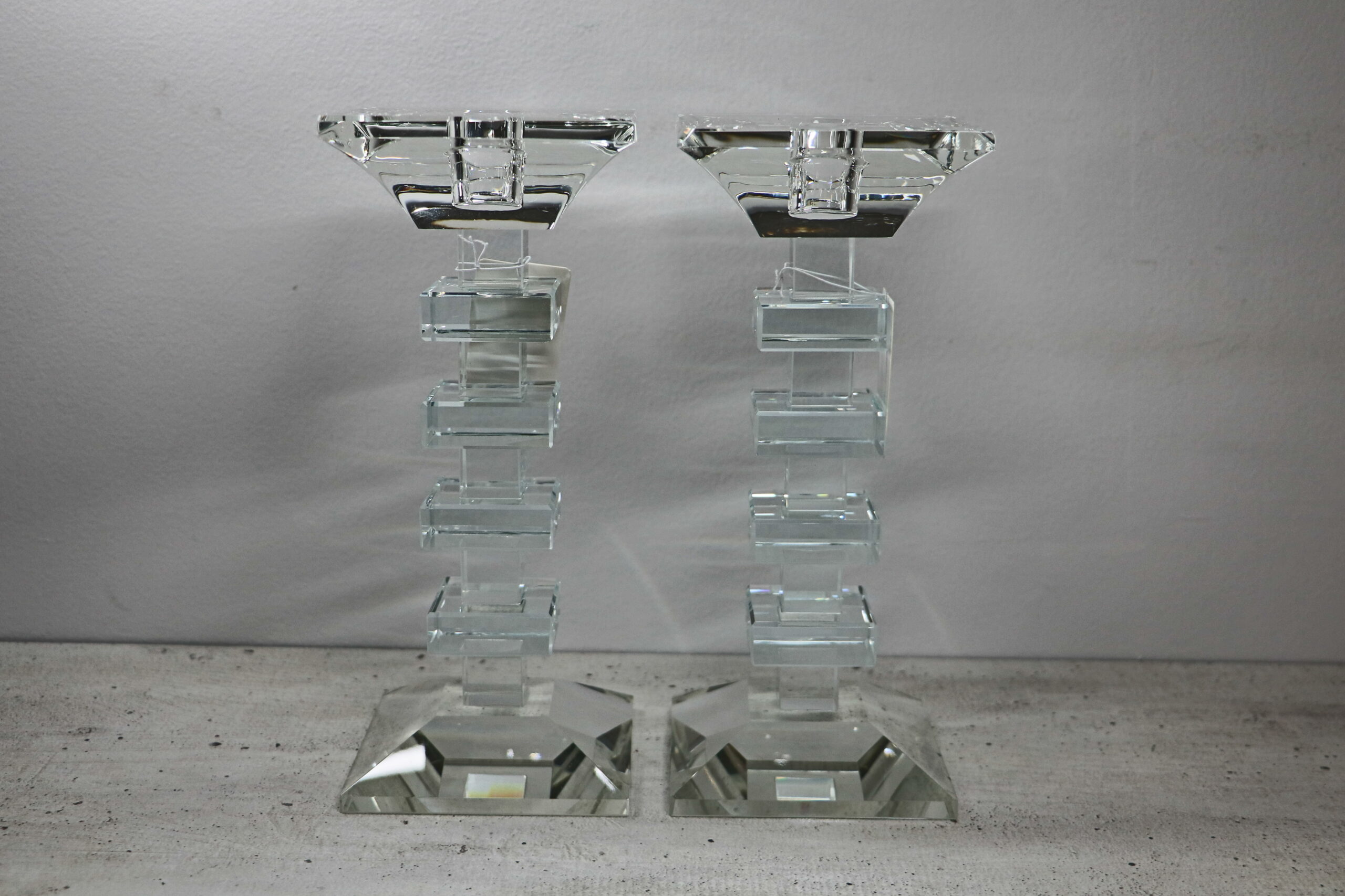 פמוט קריסטל בעיצוב מדרגות מהודר ונקי, מתאים לשולחן שבת, חגים ולעיצוב ביתי אלגנטי.