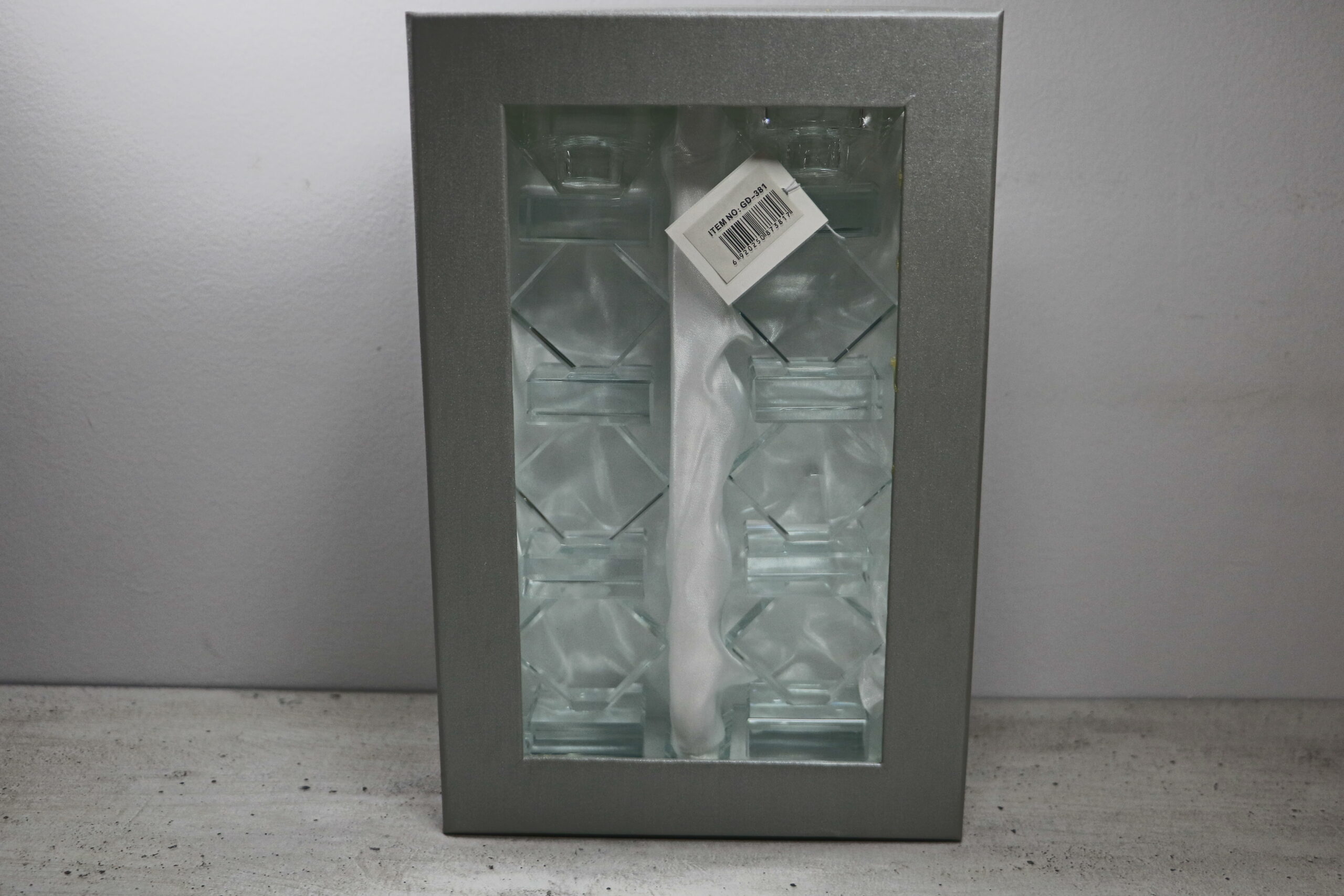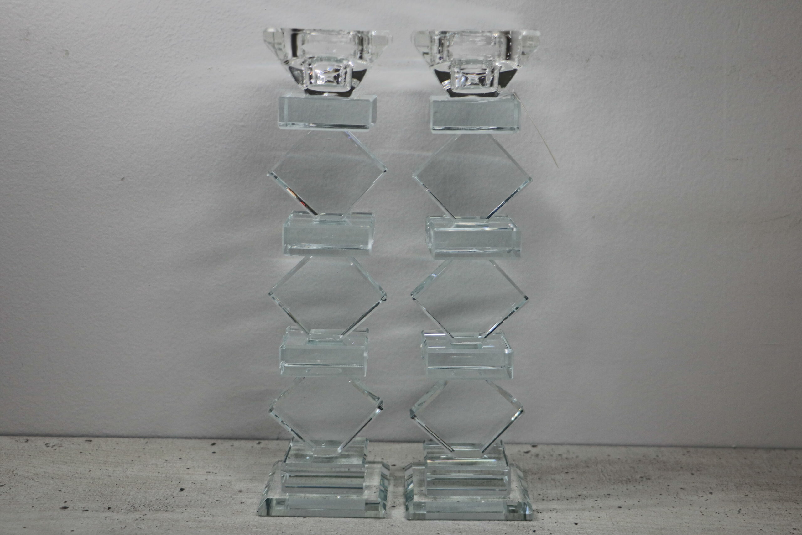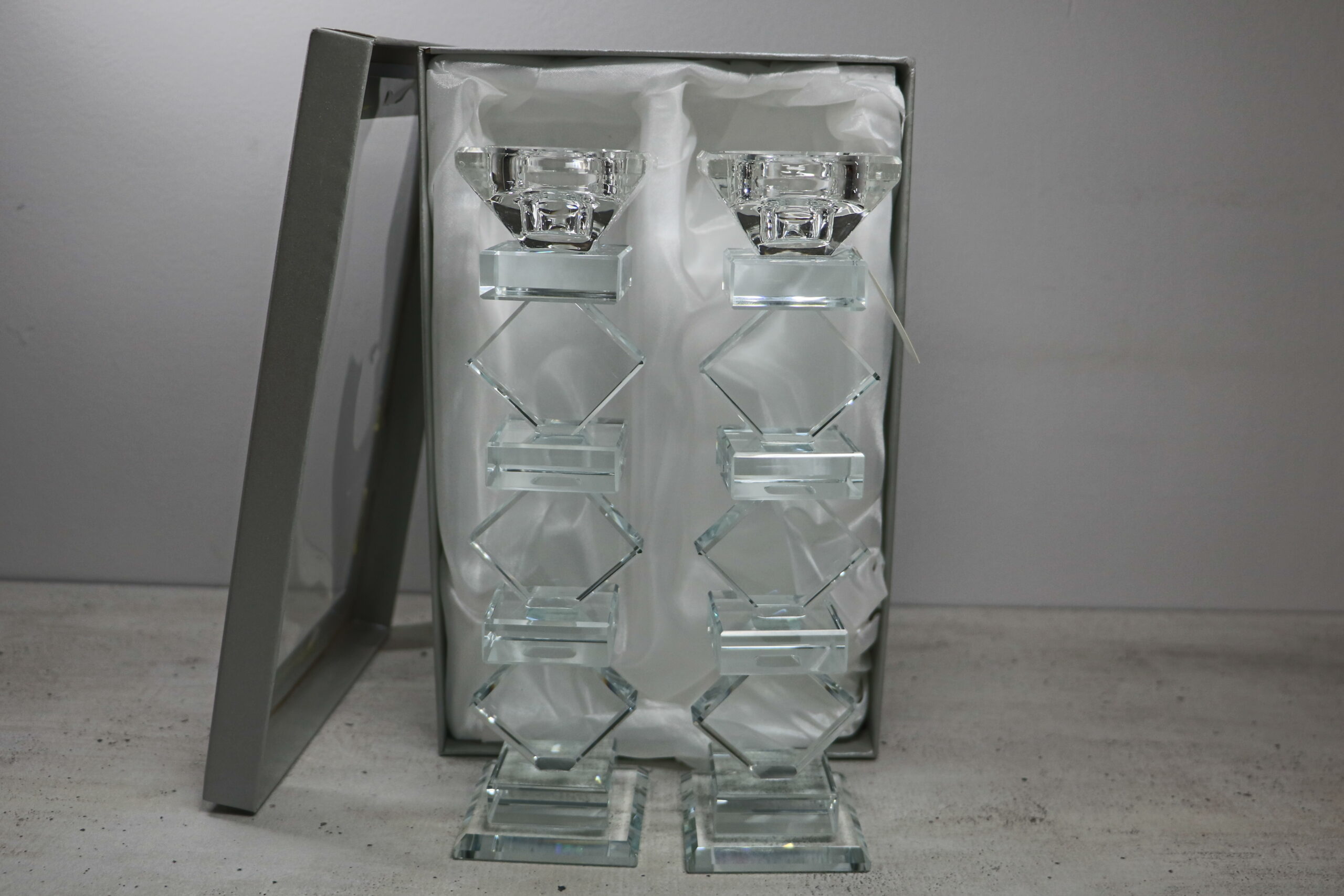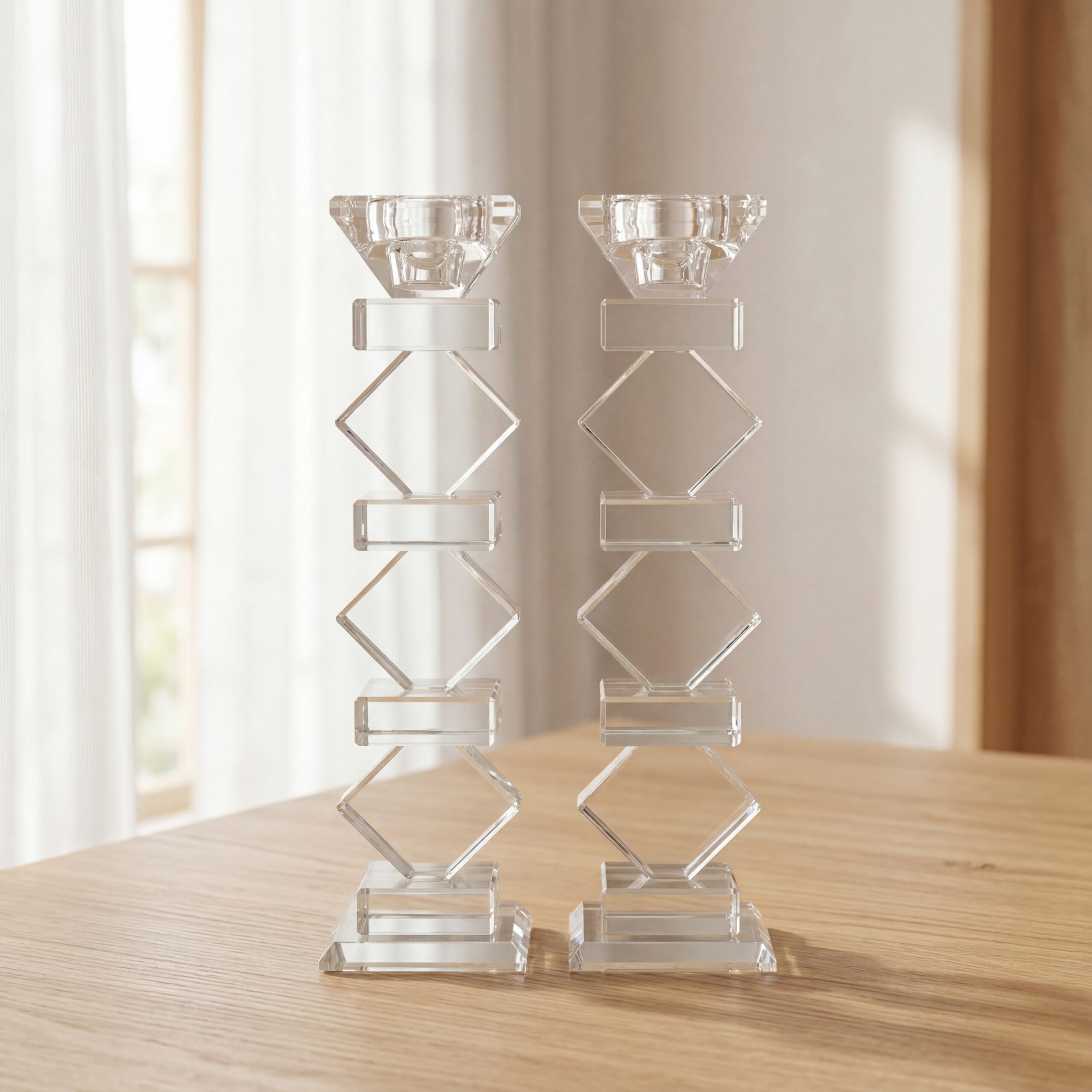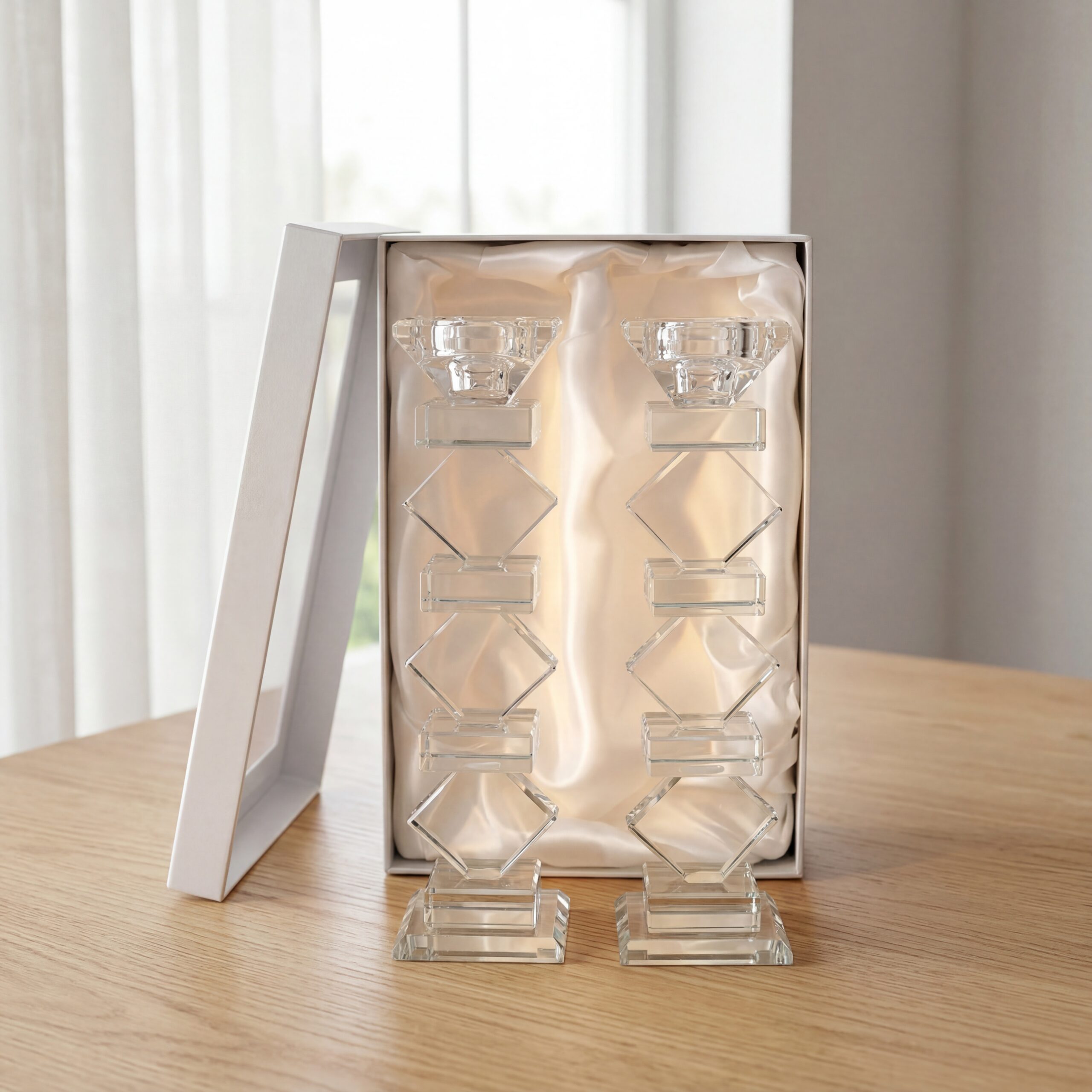 פמוט קריסטל בעיצוב משושה בינוני, נקי ואלגנטי. מתאים לשולחן שבת, חגים ולעיצוב ביתי מודרני.