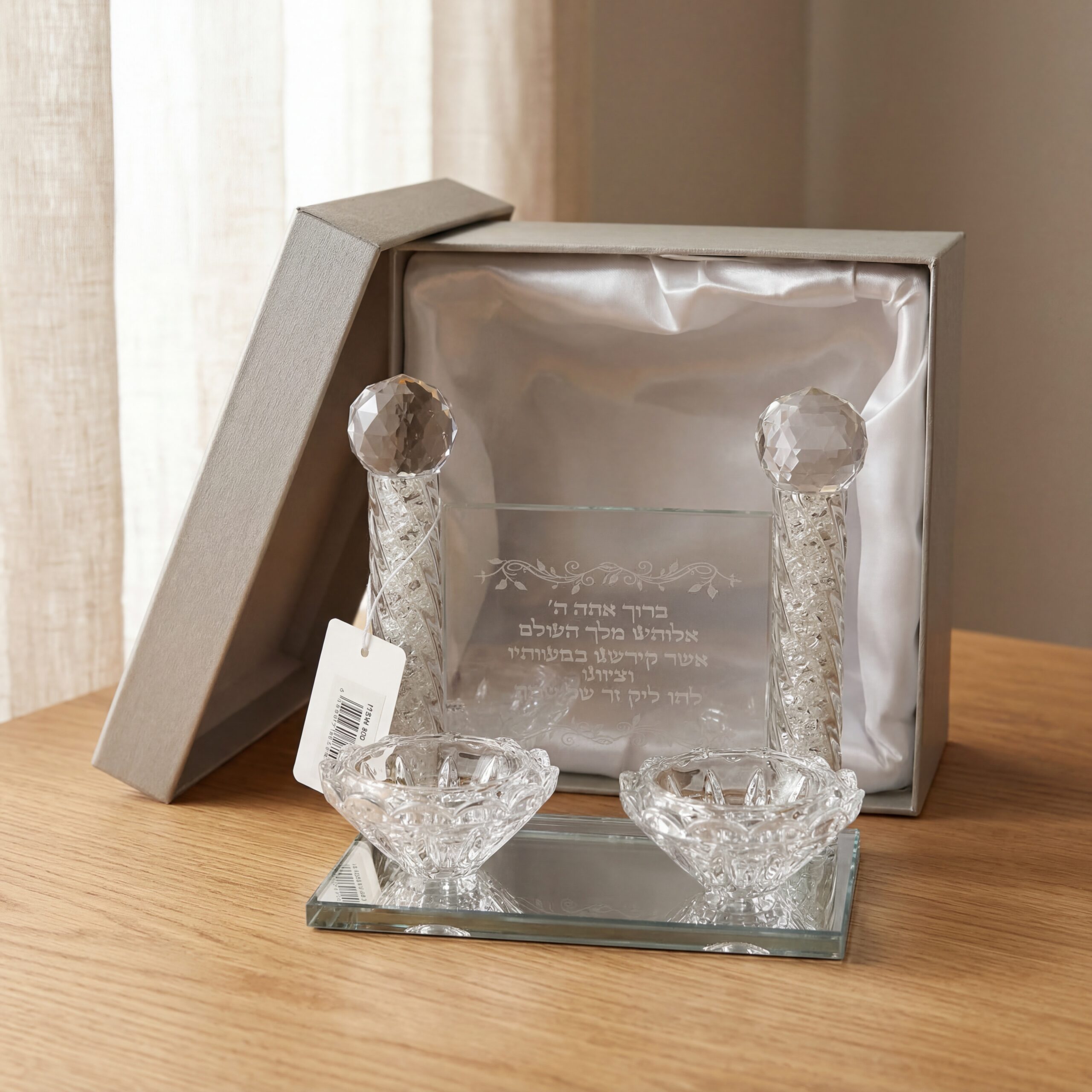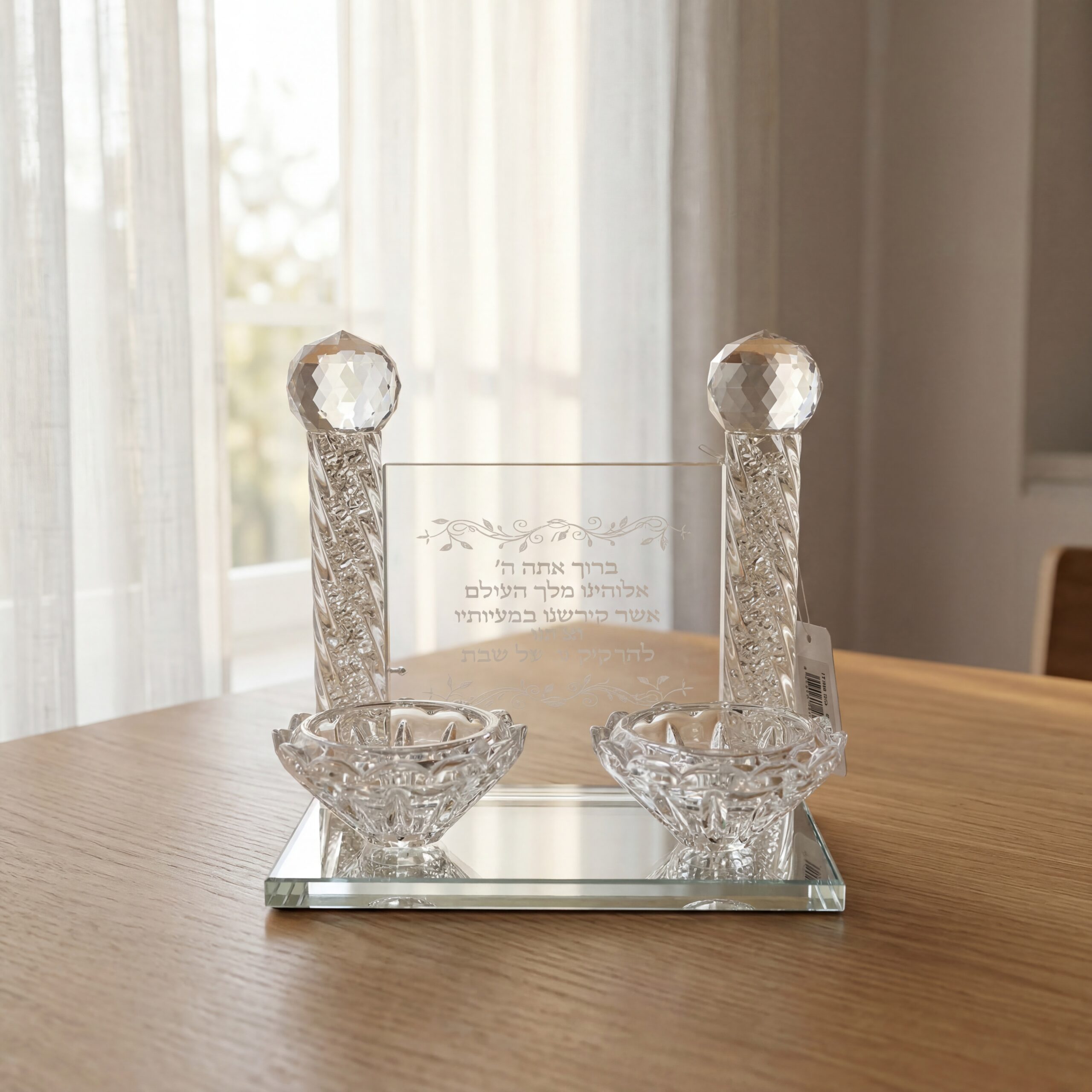 פמוט יוקרתי מזכוכית עם ברכה חרוטה, בעיצוב נמוך ואלגנטי. מתאים להדלקת נרות שבת וחג, ומשלב קדושה עם עיצוב מודרני מרשים. הפמוט מוסיף אור, שלווה ואווירה מיוחדת לכל שולחן שבת וחג.