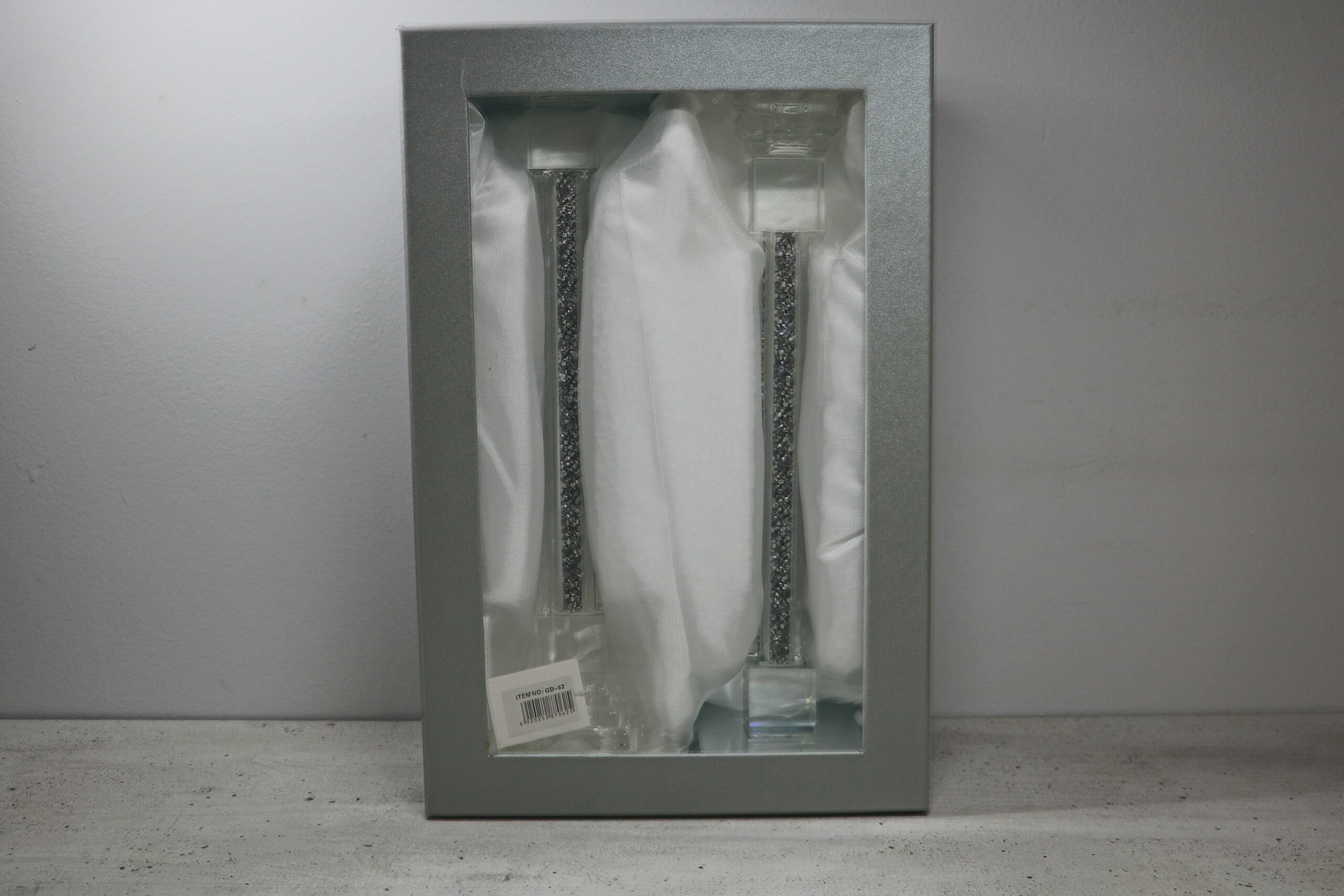 פמוט קריסטל מרשים בעיצוב גבוה ובגימור כסוף אלגנטי, המעניק מראה יוקרתי ומודרני לכל שולחן. הציפוי הכסוף בשילוב הקריסטל השקוף יוצר משחקי אור מרהיבים ומתאים במיוחד לשבתות, חגים, אירועים ולעיצוב הבית בסגנון נקי ומדויק.