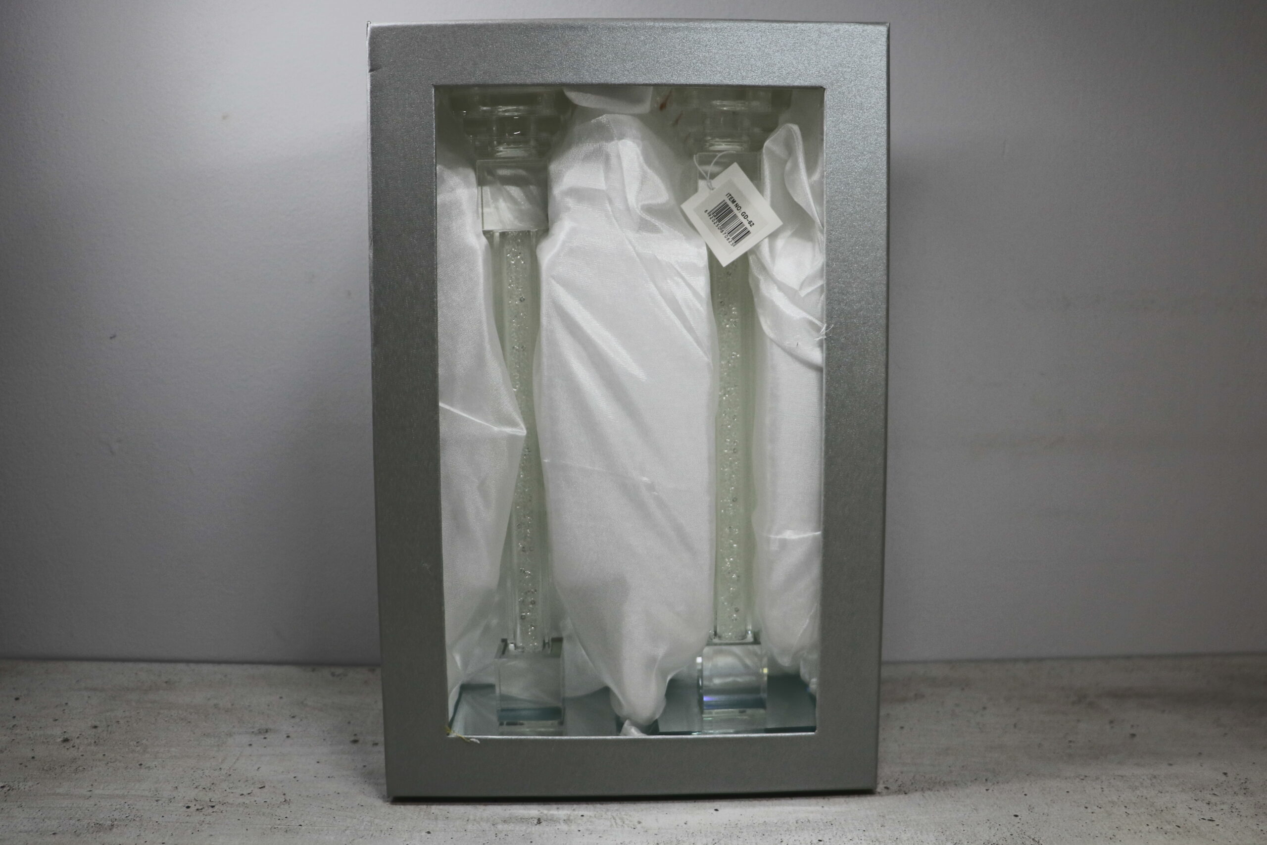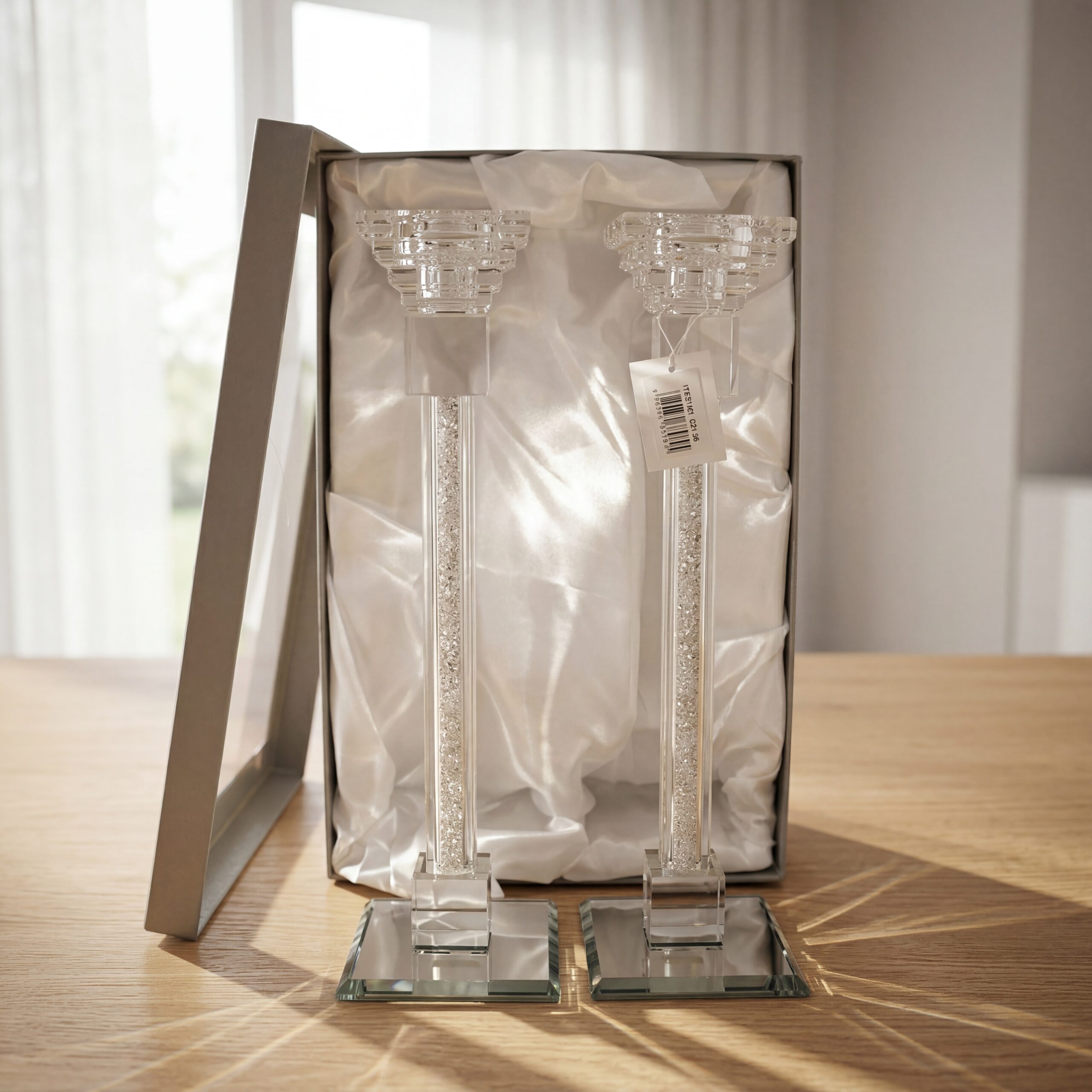 פמוט קריסטל מרשים בעיצוב גבוה ובגימור כסוף אלגנטי, המעניק מראה יוקרתי ומודרני לכל שולחן. הציפוי פנינה בשילוב הקריסטל השקוף יוצר משחקי אור מרהיבים ומתאים במיוחד לשבתות, חגים, אירועים ולעיצוב הבית בסגנון נקי ומדויק.