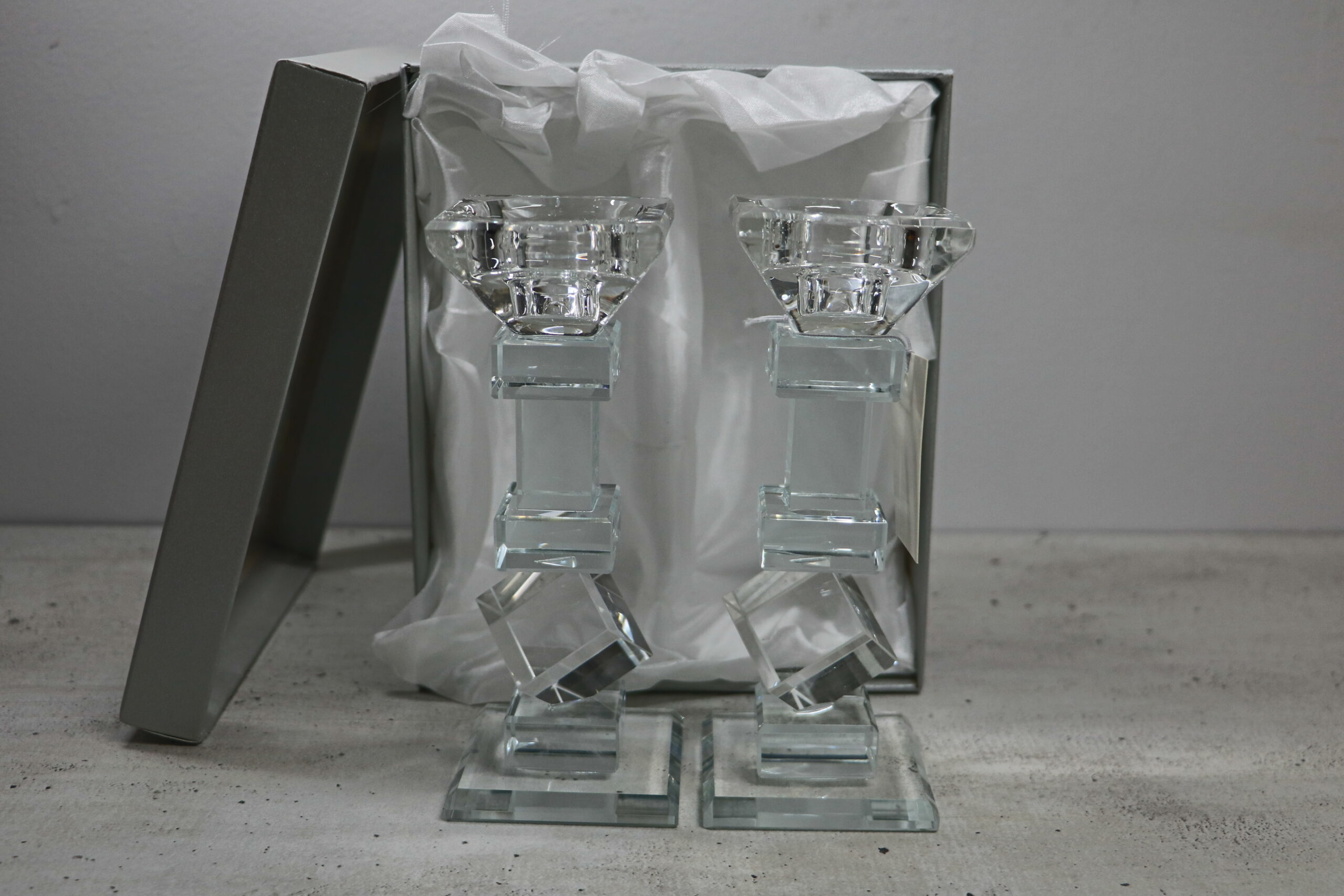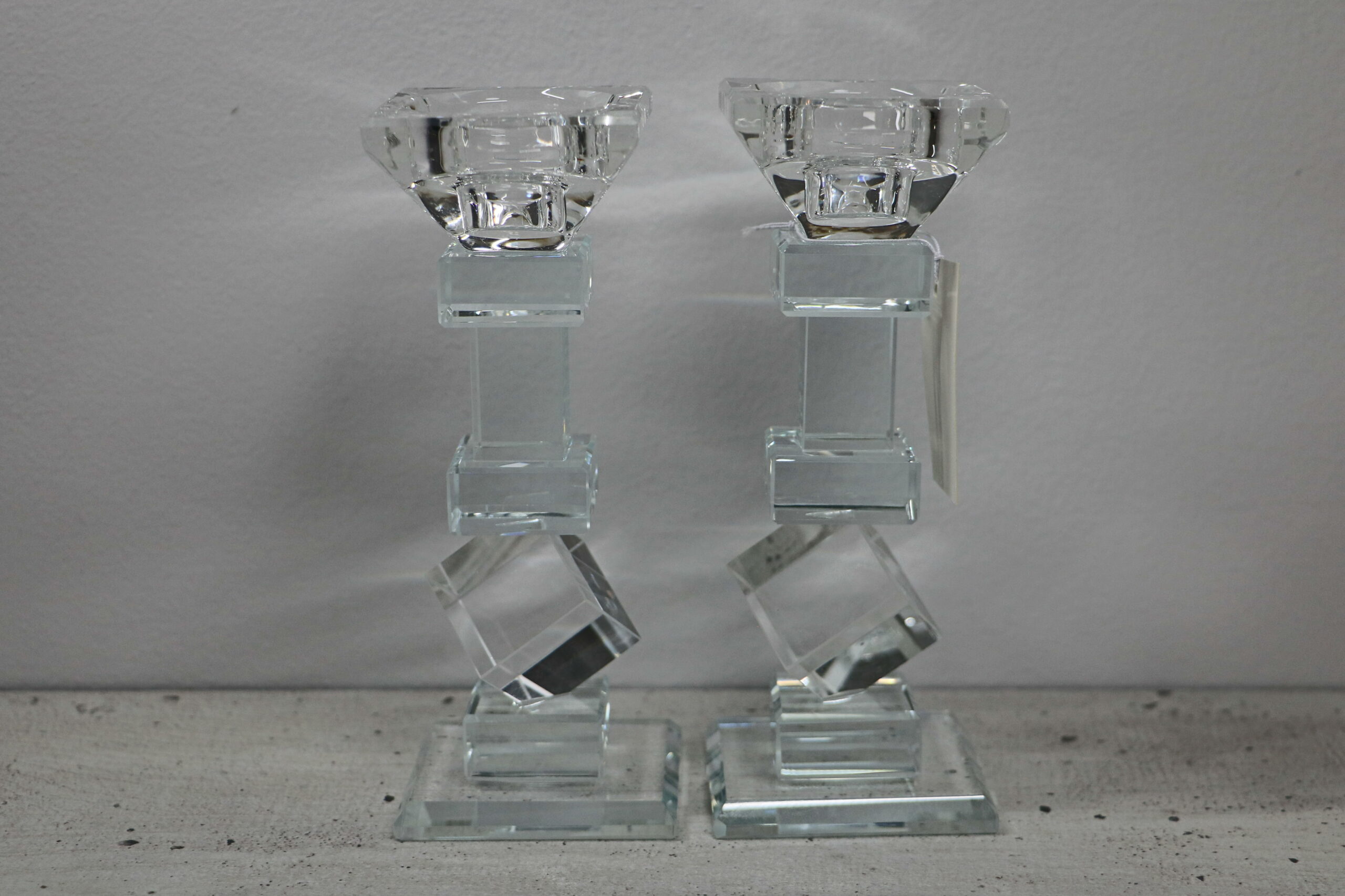 פמוט קריסטל בעיצוב ריבועים נקי ונמוך, מתאים לשולחן שבת, חגים ולעיצוב ביתי מוקפד.