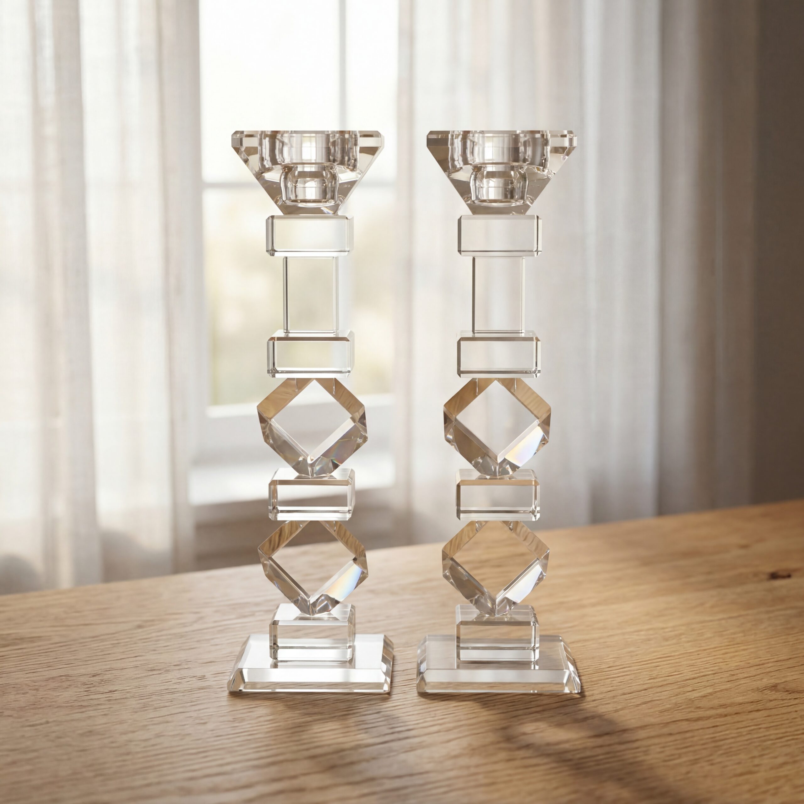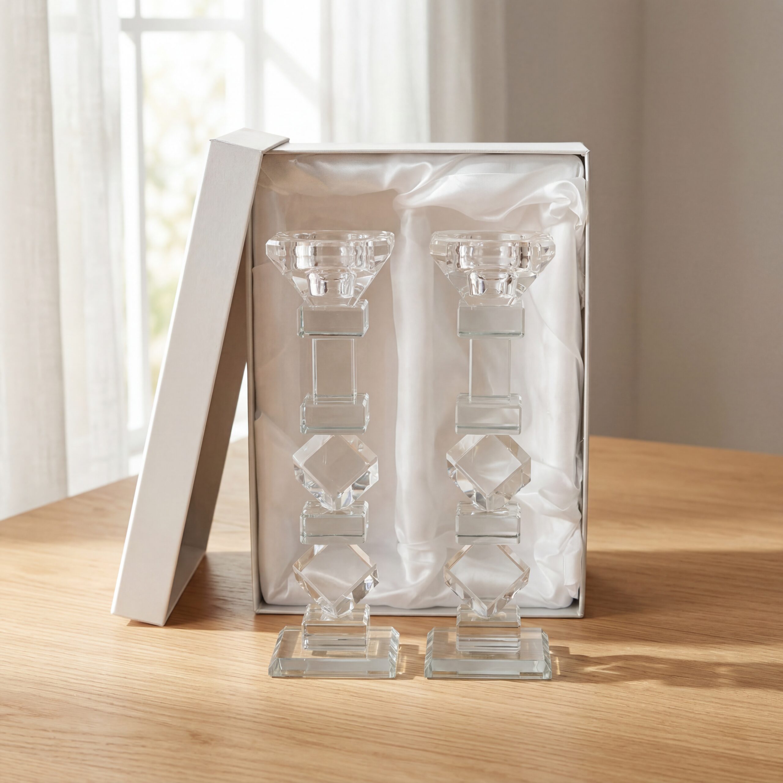 פמוט קריסטל שקוף בעיצוב ריבועים נקי ומדויק, מתאים לשולחן שבת, חגים ולעיצוב יומיומי אלגנטי.