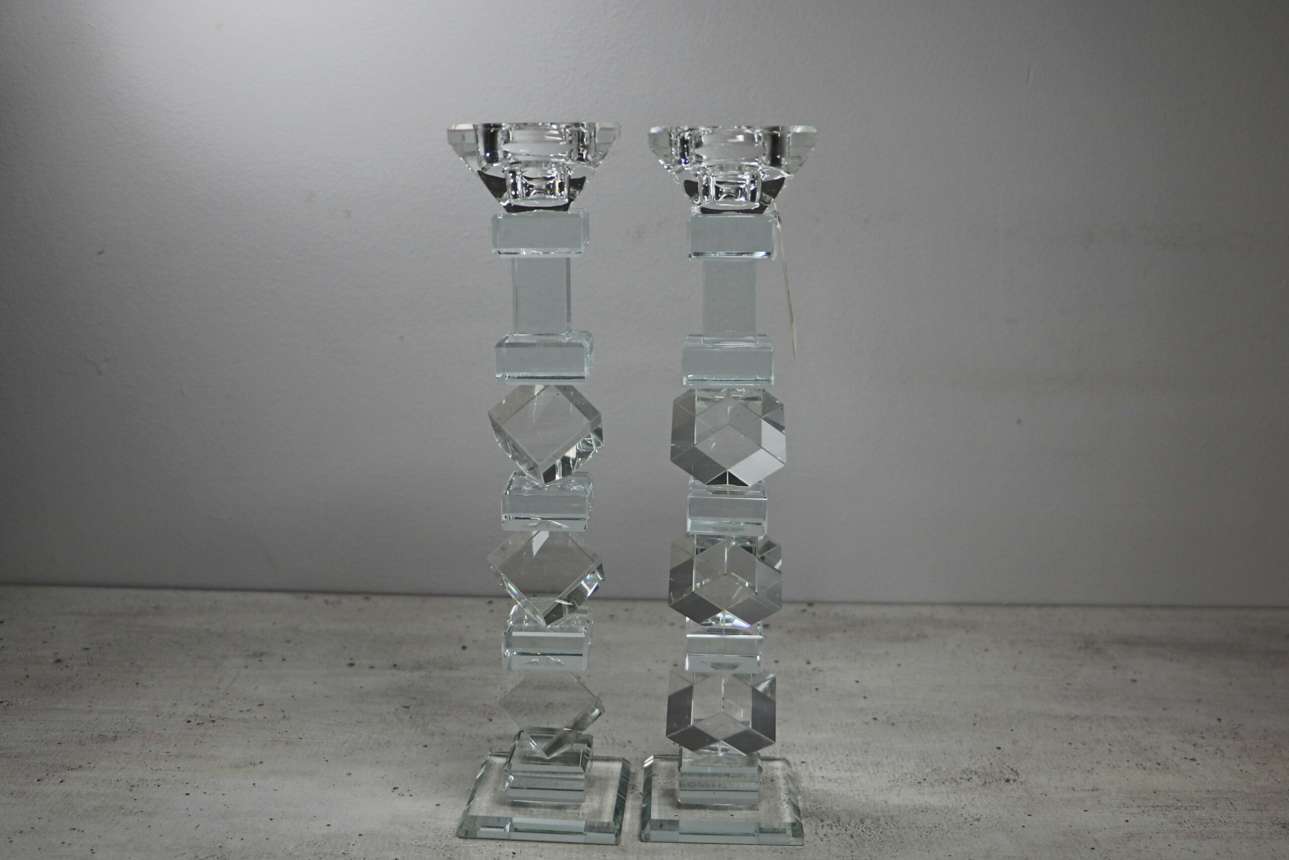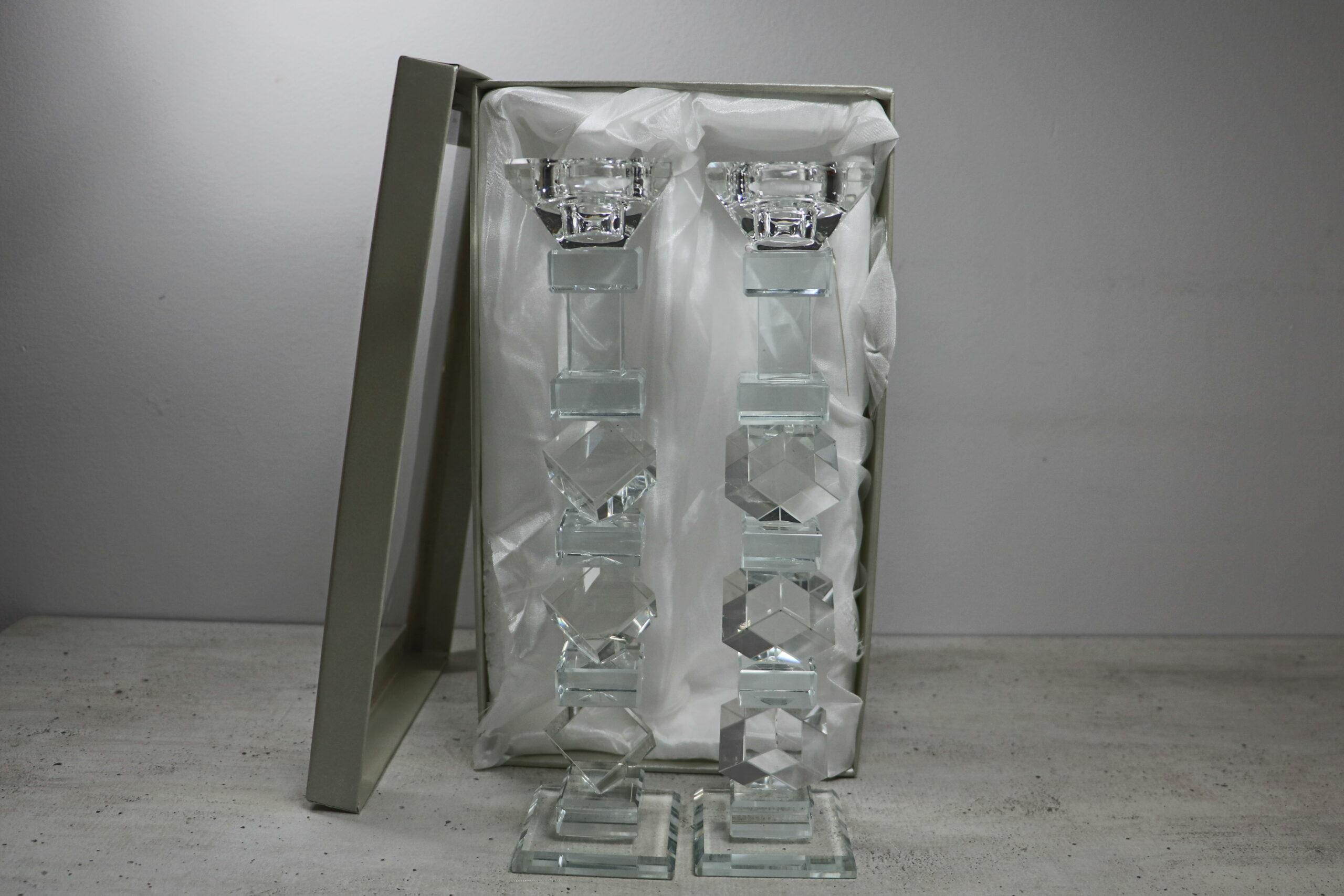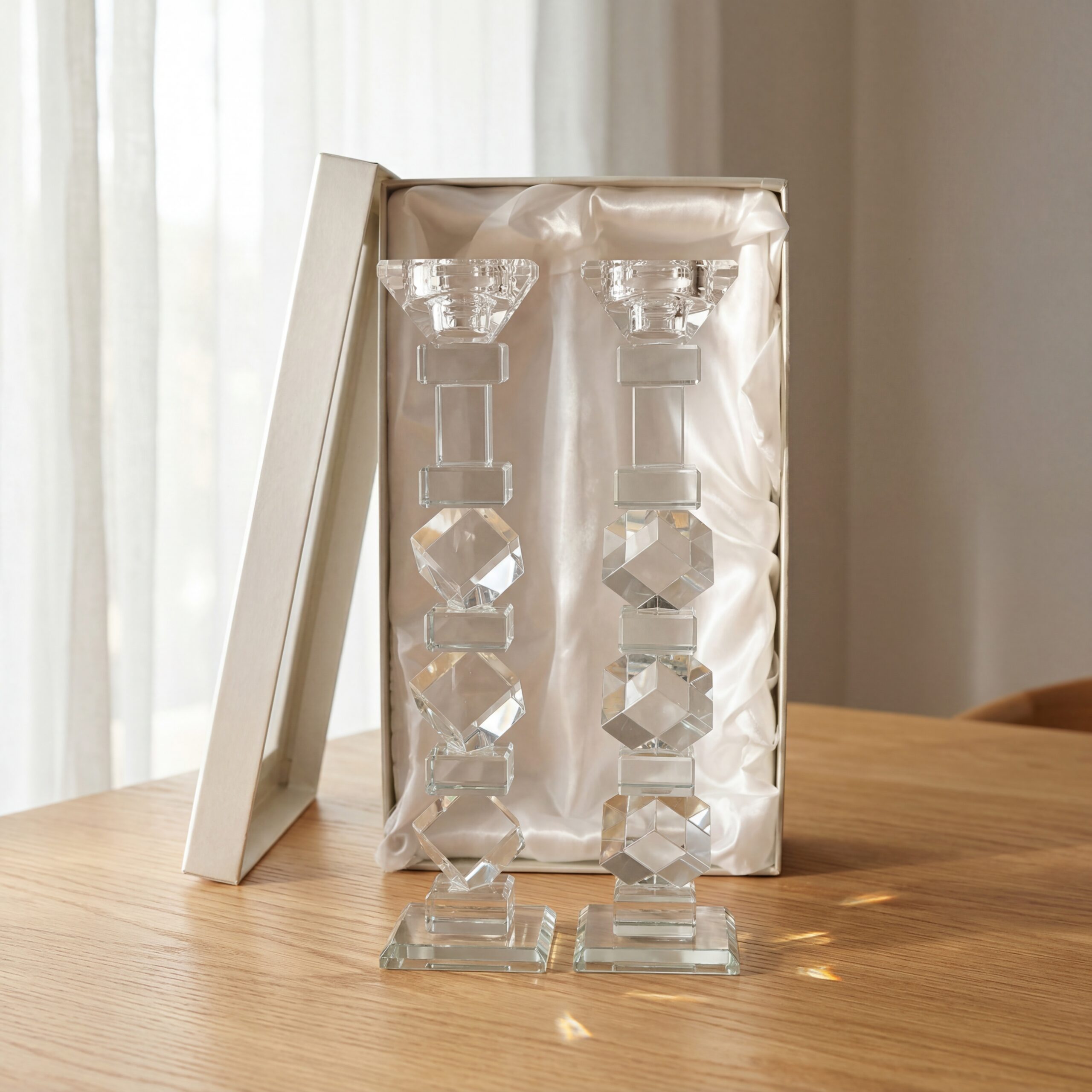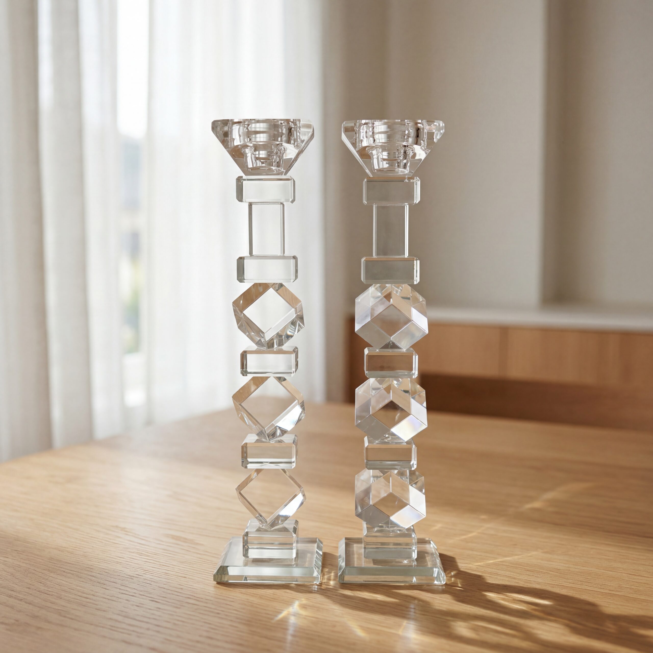 פמוט קריסטל שקוף בעיצוב ריבועים נקי ומסודר, מתאים לשולחן שבת, חגים ולעיצוב יומיומי אלגנטי.
