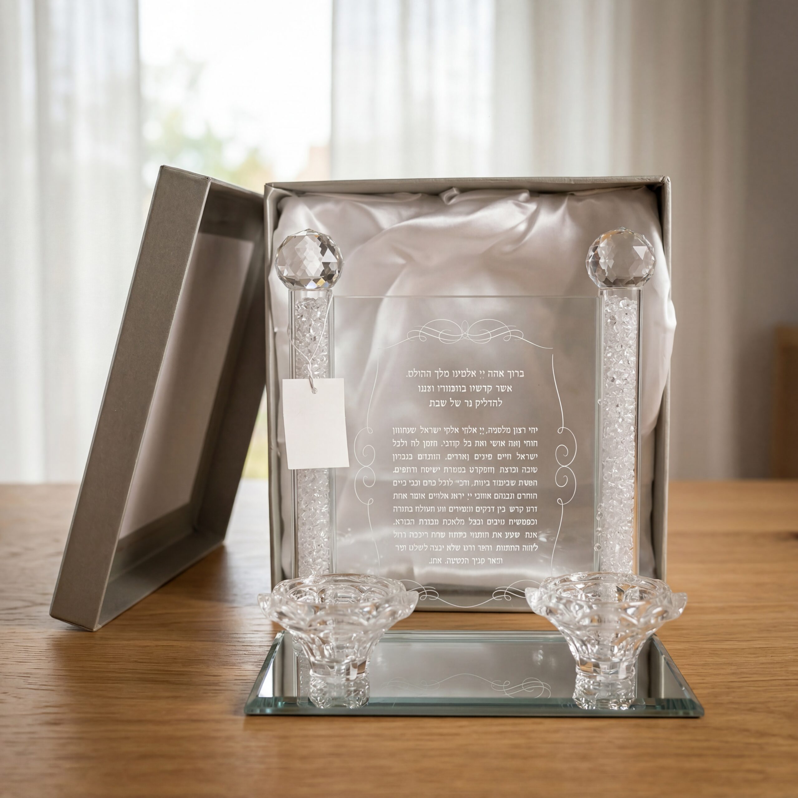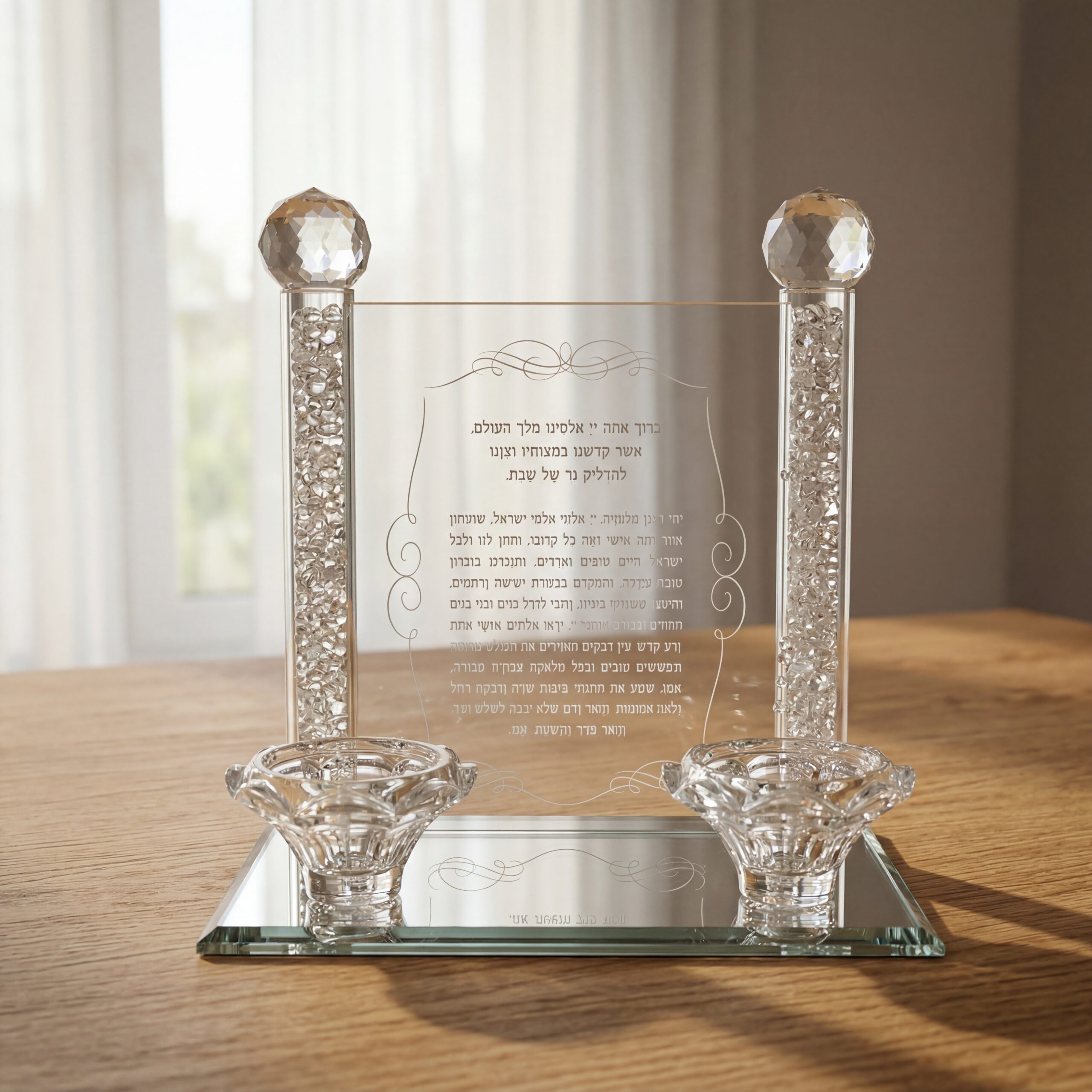 פמוט זכוכית מהודר בעיצוב ייחודי עם שני קנים וברכה חרוטה, המשלב קדושה עם יופי מודרני. מתאים להדלקת נרות שבת וחג, מוסיף אור ואווירה מיוחדת לשולחן.